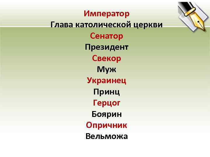 Император Глава католической церкви Сенатор Президент Свекор Муж Украинец Принц Герцог Боярин Опричник Вельможа