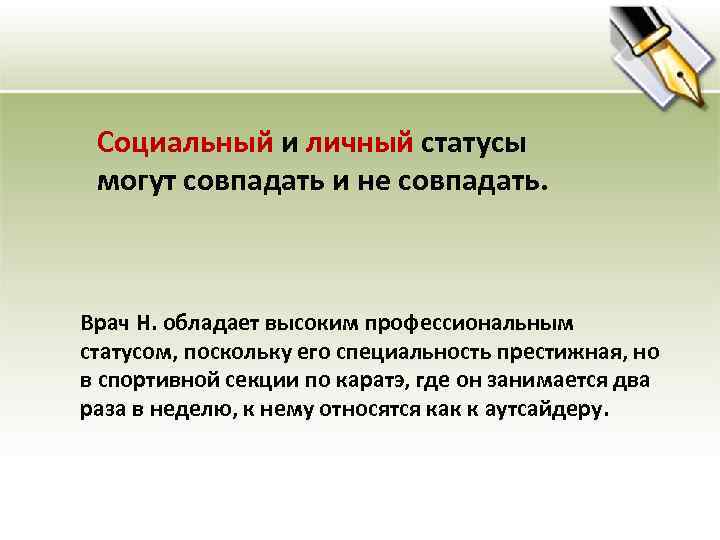 Социальный и личный статусы могут совпадать и не совпадать. Врач Н. обладает высоким профессиональным статусом, поскольку его специальность престижная, но в спортивной секции по каратэ, где он занимается два раза в неделю, к нему относятся как к аутсайдеру.