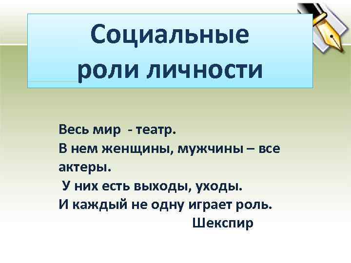 Социальные роли личности Весь мир - театр. В нем женщины, мужчины – все актеры. У них есть выходы, уходы. И каждый не одну играет роль. Шекспир