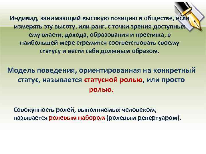 Индивид, занимающий высокую позицию в обществе, если измерять эту высоту, или ранг, с точки зрения доступных ему власти, дохода, образования и престижа, в наибольшей мере стремится соответствовать своему статусу и вести себя должным образом. Модель поведения, ориентированная на конкретный статус, называется статусной ролью, или просто ролью. Совокупность ролей, выполняемых человеком, называется ролевым набором (ролевым репертуаром).