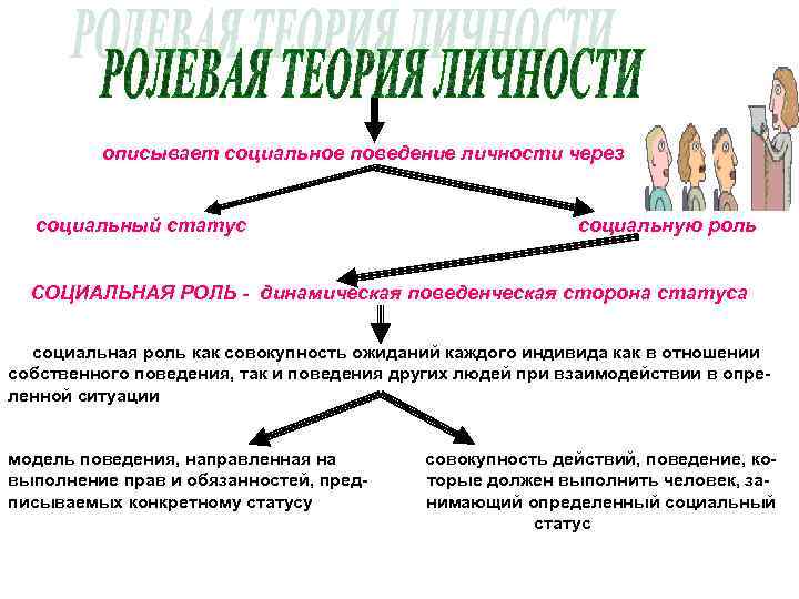 описывает социальное поведение личности через социальный статус социальную роль СОЦИАЛЬНАЯ РОЛЬ - динамическая поведенческая сторона статуса социальная роль как совокупность ожиданий каждого индивида как в отношении собственного поведения, так и поведения других людей при взаимодействии в опреленной ситуации модель поведения, направленная на выполнение прав и обязанностей, предписываемых конкретному статусу совокупность действий, поведение, которые должен выполнить человек, занимающий определенный социальный статус