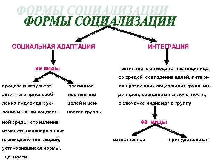 СОЦИАЛЬНАЯ АДАПТАЦИЯ ее виды ИНТЕГРАЦИЯ активное взаимодействие индивида, со средой, совпадение целей, интере- процесс и результат пассивное сов различных социальных групп, ин- активного приспособ- восприятие дивидов, социальная сплоченность, ления индивида к ус- целей и цен- включение индивида в группу ловиям новой социаль- ностей группы ной среды, стремление ее виды изменить несовершенные взаимодействия людей, установившиеся нормы, ценности естественная принудительная