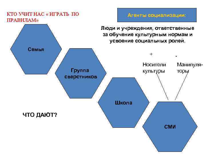 КТО УЧИТ НАС « ИГРАТЬ ПО ПРАВИЛАМ» Агенты социализации: Люди и учреждения, ответственные за обучение культурным нормам и усвоение социальных ролей. Семья + - Носители культуры Группа сверстников Школа ЧТО ДАЮТ? СМИ Манипуляторы