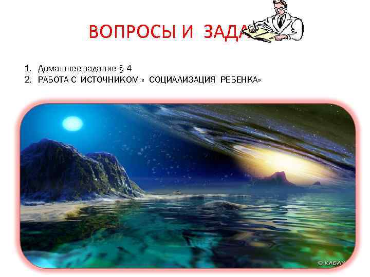 ВОПРОСЫ И ЗАДАНИЯ 1. Домашнее задание § 4 2. РАБОТА С ИСТОЧНИКОМ « СОЦИАЛИЗАЦИЯ РЕБЕНКА»