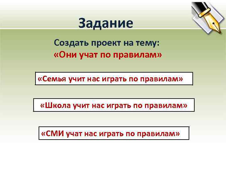 Задание Создать проект на тему: «Они учат по правилам» «Семья учит нас играть по правилам» «Школа учит нас играть по правилам» «СМИ учат нас играть по правилам»