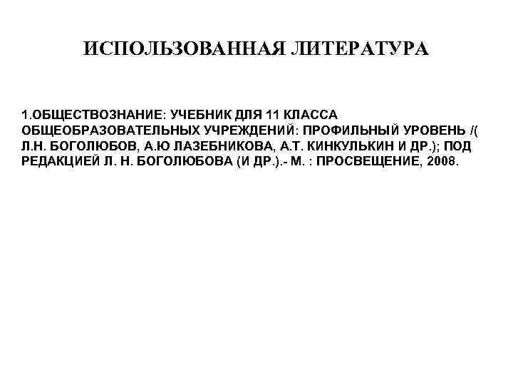 ИСПОЛЬЗОВАННАЯ ЛИТЕРАТУРА 1. ОБЩЕСТВОЗНАНИЕ: УЧЕБНИК ДЛЯ 11 КЛАССА ОБЩЕОБРАЗОВАТЕЛЬНЫХ УЧРЕЖДЕНИЙ: ПРОФИЛЬНЫЙ УРОВЕНЬ /( Л. Н. БОГОЛЮБОВ, А. Ю ЛАЗЕБНИКОВА, А. Т. КИНКУЛЬКИН И ДР. ); ПОД РЕДАКЦИЕЙ Л. Н. БОГОЛЮБОВА (И ДР. ). - М. : ПРОСВЕЩЕНИЕ, 2008.