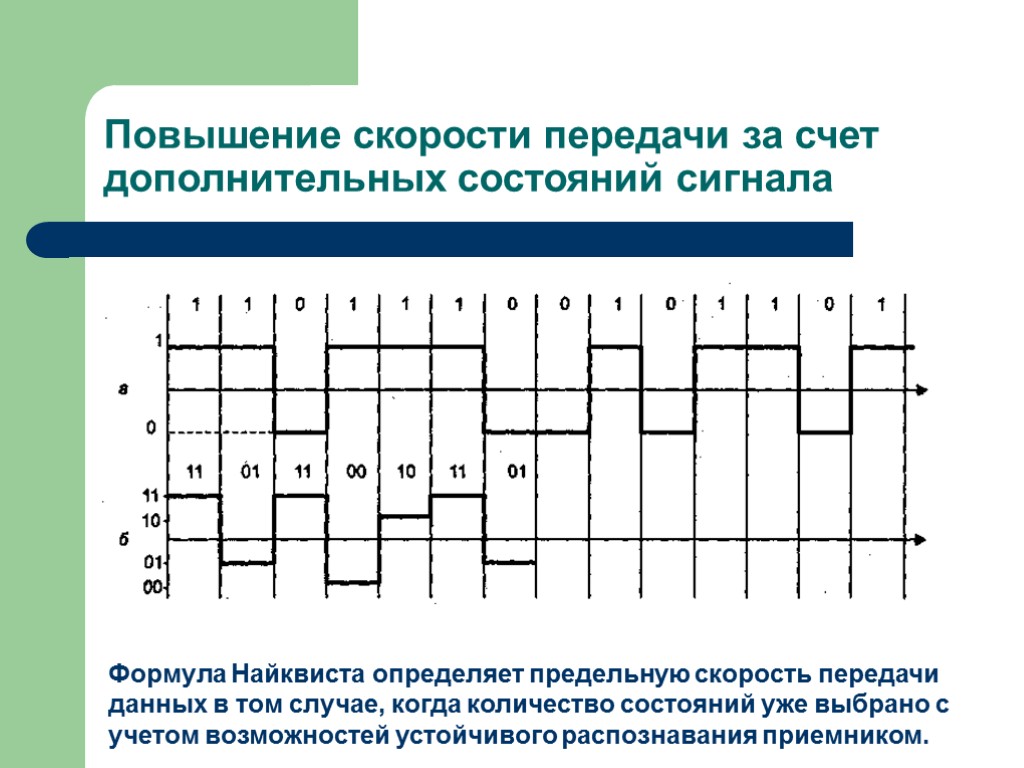 Повышение скорости передачи за счет дополнительных состояний сигнала Формула Найквиста определяет предельную скорость передачи данных в том случае, когда количество состояний уже выбрано с учетом возможностей устойчивого распознавания приемником.