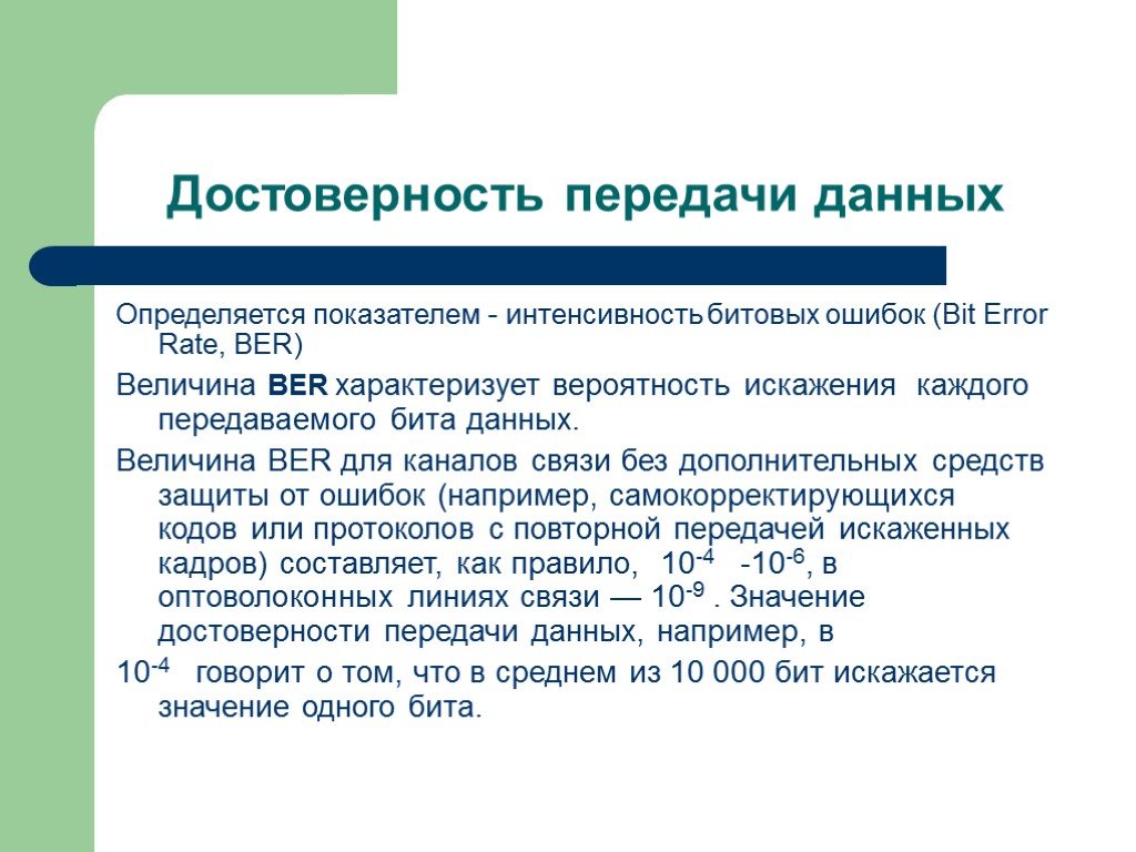 Достоверность передачи данных Определяется показателем - интенсивность битовых ошибок (Bit Error Rate, BER) Величина BER характеризует вероятность искажения каждого передаваемого бита данных. Величина BER для каналов связи без дополнительных средств защиты от ошибок (например, самокорректирующихся кодов или протоколов с повторной передачей искаженных кадров) составляет, как правило, 10-4 -10-6, в оптоволоконных линиях связи — 10-9 . Значение достоверности передачи данных, например, в 10-4 говорит о том, что в среднем из 10 000 бит искажается значение одного бита.