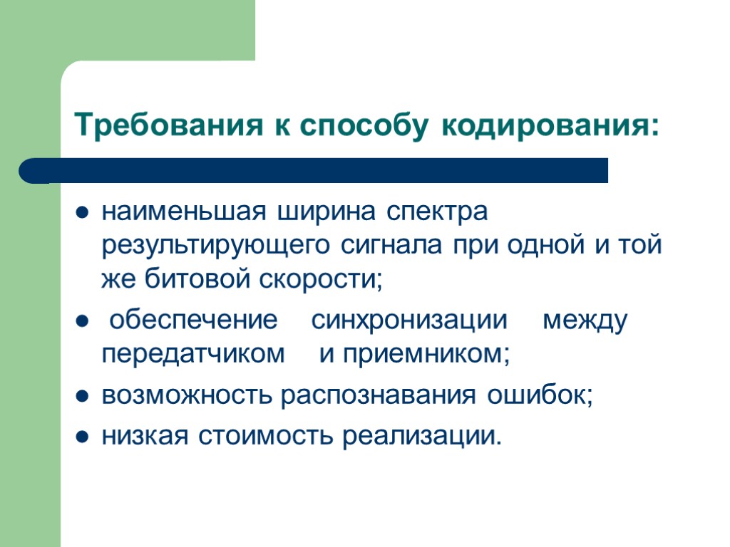 Требования к способу кодирования: наименьшая ширина спектра результирующего сигнала при одной и той же битовой скорости; обеспечение синхронизации между передатчиком и приемником; возможность распознавания ошибок; низкая стоимость реализации.