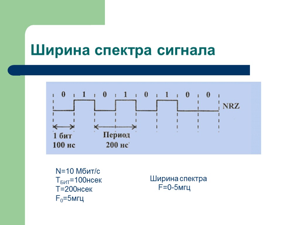 Недостатки манчестерского кода Ширина спектра в два раза выше, чем у кода NRZ, поэтому требуется вдвое большая полоса пропускания линии при той же скорости передачи. N=10 Мбит/с ТБИТ=100нсек Тмин=100нсек F0=10мгц