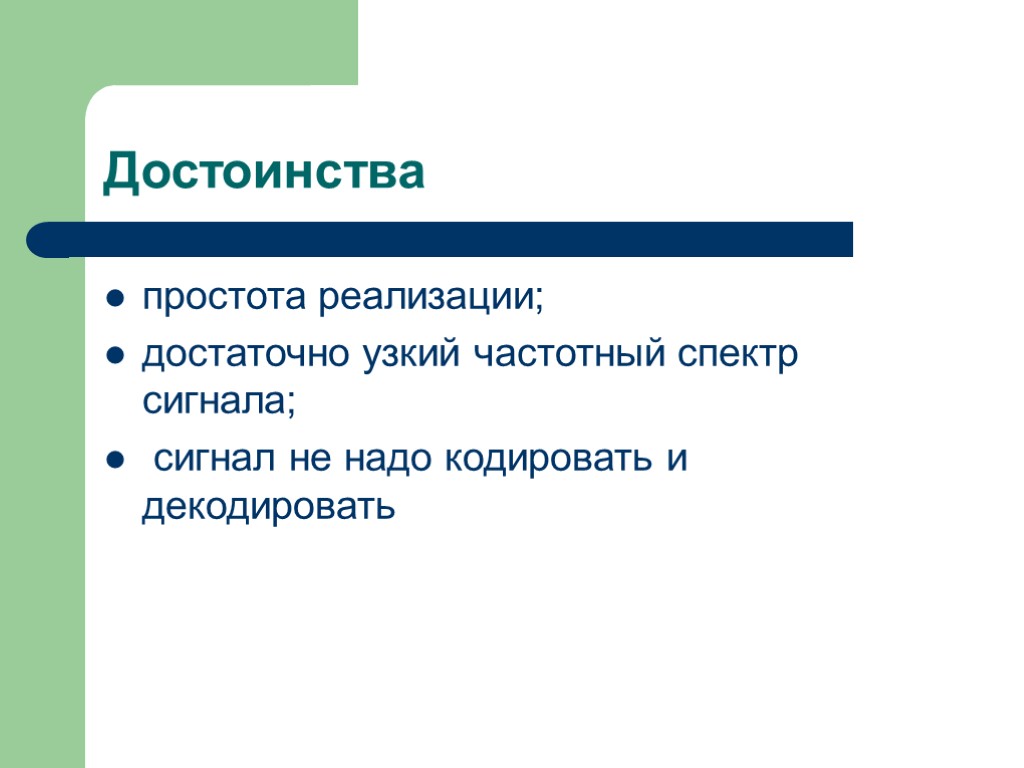 Достоинства простота реализации; достаточно узкий частотный спектр сигнала; сигнал не надо кодировать и декодировать