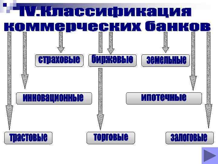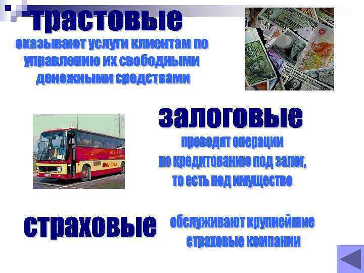 а)Специализируются на предоставлении долгосрочных ссуд под залог земли и недвижимости б)Оказывают услуги клиентам по управлению их свободными денежными средствами в)Проводят операции по кредитованию под е)Осуществляют залог операции по г)Обслуживают круппокупке и нейшие страховые продаже земли, компании а также обслуживают д)Специализируютсельскося на обслуживании хозяиственные крупных торговых предприятия фирм ж)Обслуживают биржевые операции, а также торгуют свобод – ными денежными ресурсами з)Специализируются на кредитовании новых видов деятельности, научно-технических разработок