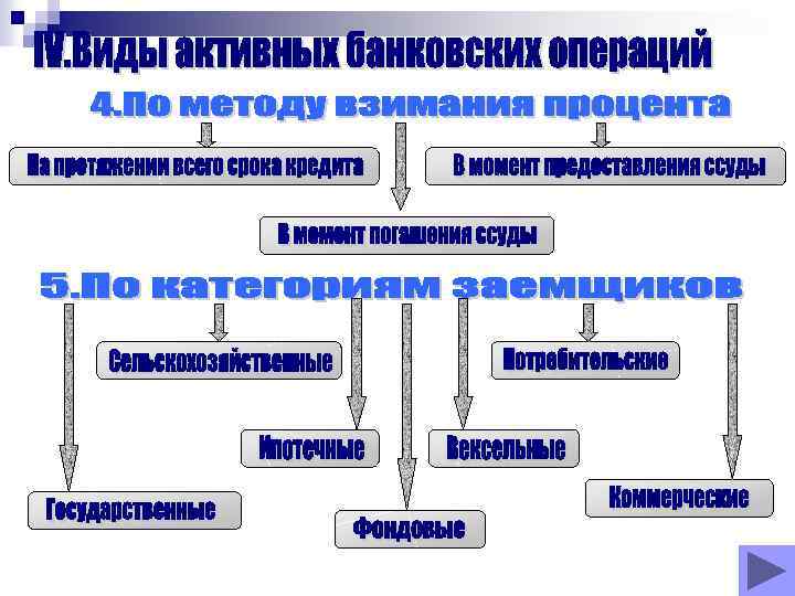 - (текущий счет), вклады которые могут быть востребованы в любой момент - вклад, с помощью которого можно расплачиваться только в пределах суммы на текущем счете (дебетные карточки) - вклад, с помощью которого можно расплачиваться выходя за пределы суммы на текущем счете (кредитные карточки) - вклад, который нельзя снять в любой момент, а только в определенный срок - банк ими распоряжается, по окончании срока используется как текущий счет