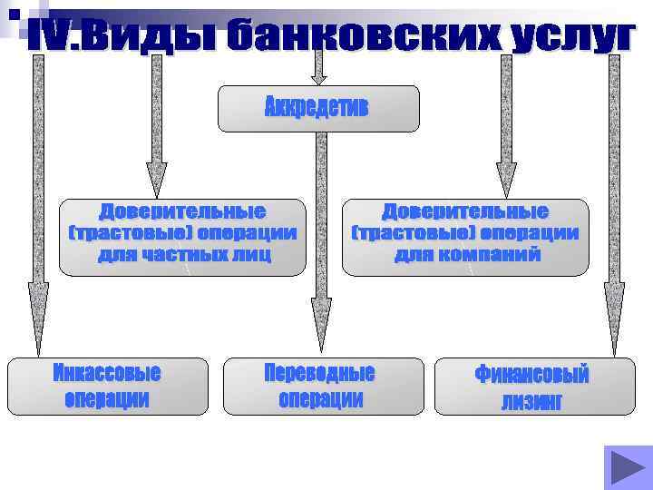 - поручение о выплате определенной суммы лицу или компании при указанных условиях - временное управление имуществом, капиталом частных лиц -временное управление имуществом, капиталом компаний, например пенсионных фондов - перечисление внесенных в банк денег получателю, который находиться в другом месте -приобретение дорогостоящих машин и оборудования и сдача их в аренду - банк по поручению своего клиента получает деньги по денежным и товарно-расчетным документам