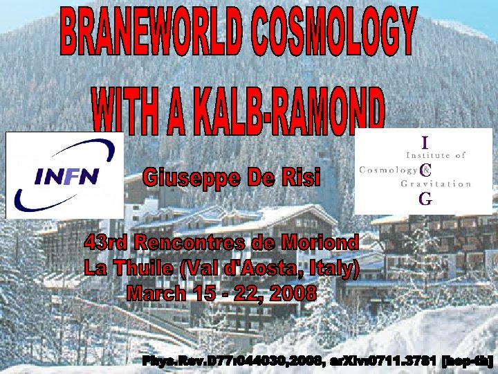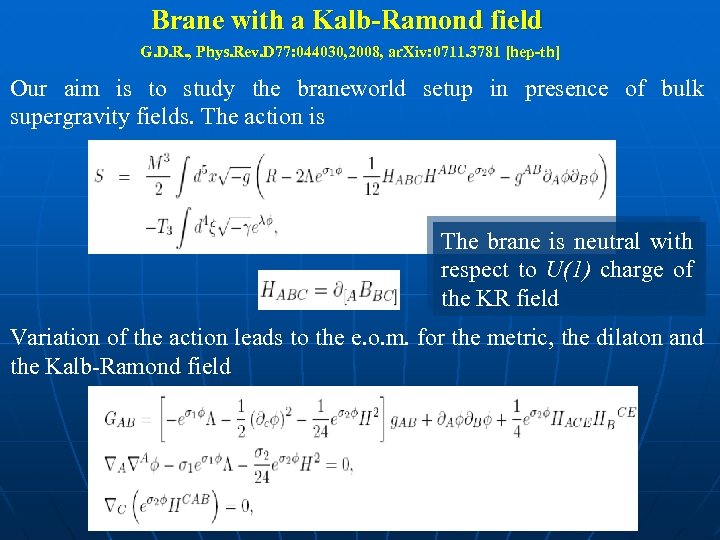 Brane with a Kalb-Ramond field G. D. R. , Phys. Rev. D 77: 044030, 2008, ar. Xiv: 0711. 3781 [hep-th] Our aim is to study the braneworld setup in presence of bulk supergravity fields. The action is The brane is neutral with respect to U(1) charge of the KR field Variation of the action leads to the e. o. m. for the metric, the dilaton and the Kalb-Ramond field