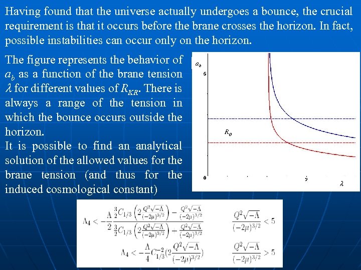 Having found that the universe actually undergoes a bounce, the crucial requirement is that it occurs before the brane crosses the horizon. In fact, possible instabilities can occur only on the horizon. The figure represents the behavior of ab as a function of the brane tension l for different values of RKR. There is always a range of the tension in which the bounce occurs outside the horizon. It is possible to find an analytical solution of the allowed values for the brane tension (and thus for the induced cosmological constant) ab R 0 l
