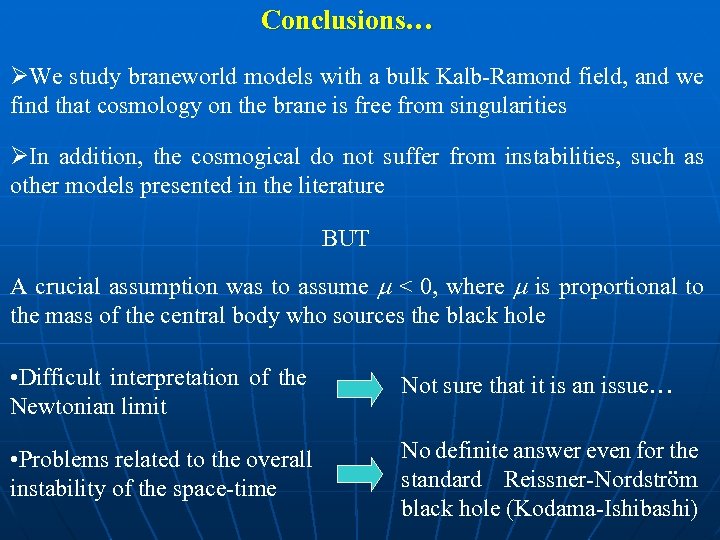 Conclusions… ØWe study braneworld models with a bulk Kalb-Ramond field, and we find that cosmology on the brane is free from singularities ØIn addition, the cosmogical do not suffer from instabilities, such as other models presented in the literature BUT A crucial assumption was to assume m < 0, where m is proportional to the mass of the central body who sources the black hole • Difficult interpretation of the Newtonian limit Not sure that it is an issue… • Problems related to the overall instability of the space-time No definite answer even for the standard Reissner-Nordström black hole (Kodama-Ishibashi)