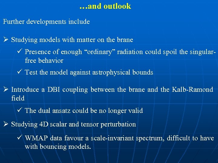 …and outlook Further developments include Ø Studying models with matter on the brane ü Presence of enough “ordinary” radiation could spoil the singularfree behavior ü Test the model against astrophysical bounds Ø Introduce a DBI coupling between the brane and the Kalb-Ramond field ü The dual ansatz could be no longer valid Ø Studying 4 D scalar and tensor perturbation ü WMAP data favour a scale-invariant spectrum, difficult to have with bouncing models.