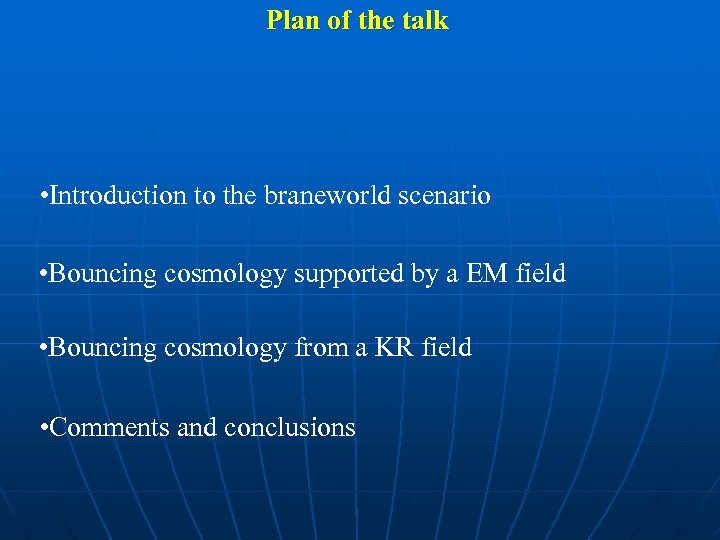 Plan of the talk • Introduction to the braneworld scenario • Bouncing cosmology supported by a EM field • Bouncing cosmology from a KR field • Comments and conclusions