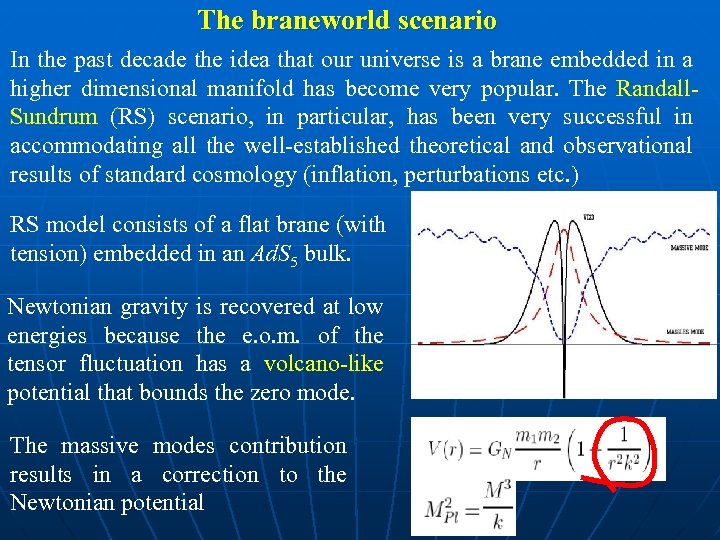 The braneworld scenario In the past decade the idea that our universe is a brane embedded in a higher dimensional manifold has become very popular. The Randall. Sundrum (RS) scenario, in particular, has been very successful in accommodating all the well-established theoretical and observational results of standard cosmology (inflation, perturbations etc. ) RS model consists of a flat brane (with tension) embedded in an Ad. S 5 bulk. Newtonian gravity is recovered at low energies because the e. o. m. of the tensor fluctuation has a volcano-like potential that bounds the zero mode. The massive modes contribution results in a correction to the Newtonian potential