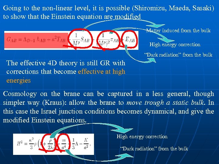 Going to the non-linear level, it is possible (Shiromizu, Maeda, Sasaki) to show that the Einstein equation are modified Matter induced from the bulk High energy correction “Dark radiation” from the bulk The effective 4 D theory is still GR with corrections that become effective at high energies Cosmology on the brane can be captured in a less general, though simpler way (Kraus): allow the brane to move trough a static bulk. In this case the Israel junction conditions becomes dynamical, and give the modified Einstein equations. High energy correction “Dark radiation” from the bulk