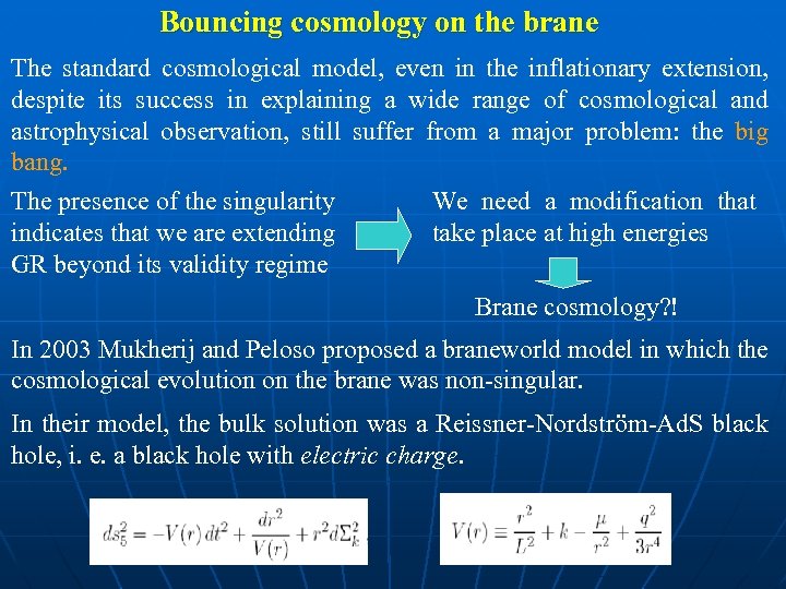 Bouncing cosmology on the brane The standard cosmological model, even in the inflationary extension, despite its success in explaining a wide range of cosmological and astrophysical observation, still suffer from a major problem: the big bang. The presence of the singularity We need a modification that indicates that we are extending take place at high energies GR beyond its validity regime Brane cosmology? ! In 2003 Mukherij and Peloso proposed a braneworld model in which the cosmological evolution on the brane was non-singular. In their model, the bulk solution was a Reissner-Nordström-Ad. S black hole, i. e. a black hole with electric charge.