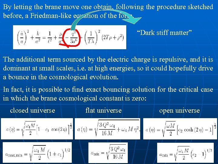 By letting the brane move one obtain, following the procedure sketched before, a Friedman-like equation of the form. “Dark stiff matter” The additional term sourced by the electric charge is repulsive, and it is dominant at small scales, i. e. at high energies, so it could hopefully drive a bounce in the cosmological evolution. In fact, it is possible to find exact bouncing solution for the critical case in which the brane cosmological constant is zero: closed universe flat universe open universe