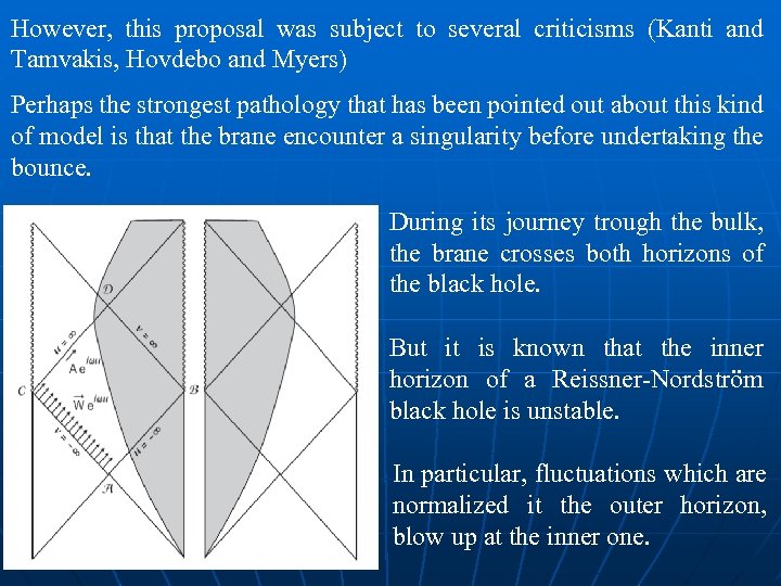 However, this proposal was subject to several criticisms (Kanti and Tamvakis, Hovdebo and Myers) Perhaps the strongest pathology that has been pointed out about this kind of model is that the brane encounter a singularity before undertaking the bounce. During its journey trough the bulk, the brane crosses both horizons of the black hole. But it is known that the inner horizon of a Reissner-Nordström black hole is unstable. In particular, fluctuations which are normalized it the outer horizon, blow up at the inner one.