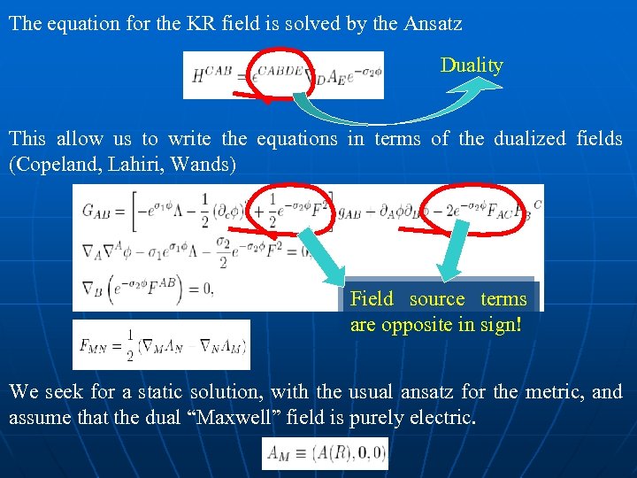 The equation for the KR field is solved by the Ansatz Duality This allow us to write the equations in terms of the dualized fields (Copeland, Lahiri, Wands) Field source terms are opposite in sign! We seek for a static solution, with the usual ansatz for the metric, and assume that the dual “Maxwell” field is purely electric.