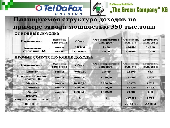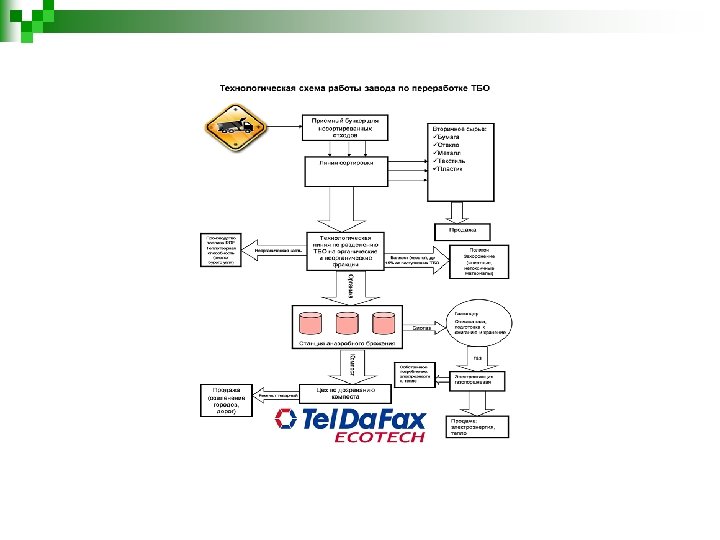 Основы проекта n n n n В установке Tel. Da. Fax/Iu. T пeрерабатывается от 100. 000 до 500. 000 тонн несортированных городских отходов (ТБО). Для технологии Tel. Da. Fax/Iu. T не требуется система раздельного сбора мусора, а следовательно, и связанных с ней высоких затрат для города и его жителей. По технологии Tel. Da. Fax/Iu. T перерабатываются почти все виды отходов, включая иловые шлаки, компостные отходы, производственные и промышленные отходы, строительный мусор (C+D). Кроме того, при помощи технологии Tel. Da. Fax/Iu. T перерабатываются отходы с высокой степенью влагосодержания. В обычных же установках для сжигания мусора с ними возникают сложности. В результате применения технологии Tel. Da. Fax/Iu. T получается биомасса высокой калорийности. Ее можно использовать в качестве покрытия для депонирования мусора или преобразовать в компост либо в экологически чистое «мусорное» топливо (RDF), которое используется для выработки электроэнергии. Полученные по технологии Tel. Da. Fax/Iu. T из отходов продукты – это высококачественные черные и цветные металлы, различные виды пластмасс, стекло и строительные материалы, которые можно снова использовать или предлагать на продажу. Технология Tel. Da. Fax/Iu. T построена по модульной системе и может быть изменена при малых затратах в зависимости от качества и количества поступающих для переработки отходов.