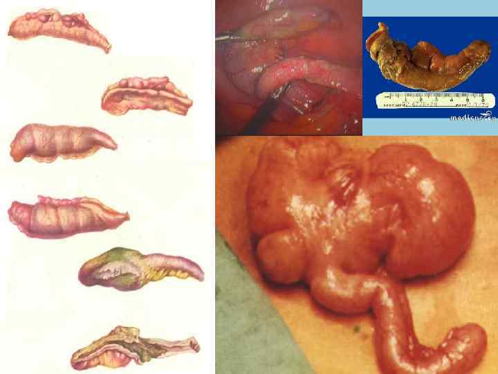 АТИПИЧНЫЕ ФОРМЫ ОСТРОГО АППЕНДИЦИТА Ретроцекальный аппендицит, при котором взамен защитно го мышечного напряжения в правой подвздошной области и симп тома. Щеткина Блюмберга более характерны симптомы интоксика ции, гектическое повышение температуры тела и перемещение бо лей в поясницу с отдачей в правое бедро, в уретру с легкой кон трактурой правого тазобедренного сустава (симптомом псоита). Тазовый аппендицит, при котором на первый план выступа ютчастые позывы на низ с умеренными слизистыми выделениями из прямой кишки. Редко наблюдаемое подпеченочное расположение червеобразного отростка при наличии болезненности и симптомов раздражения брюшины в правом подреберье может симулировать острый холецистит, однако различие анамнестических данных и отсутствие часто пальпируемого при остром холецистите желчного пузыря помогают правильно поставить диагноз.