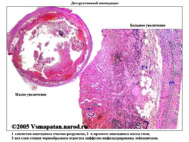Патологическая анатомия Катаральный — лейкоцитарная инфильтрация только слизистой оболочки Поверхностный — образование первичного аффекта треугольной формы, основанием обращённого в просвет, лейкоцитарная инфильтрация только слизистой оболочки. В просвете кровь, лейкоциты. Флегмонозный — лейкоцитарная инфильтрация всех слоёв ч. о. , в том числе и серозной оболочки, в просвете кровь, лейкоциты, на серозной оболочке фибрин, лейкоциты. Флегмонозно-язвенный — лейкоцитарная инфильтрация всех слоёв отростка, в том числе и серозной оболочки. Изъязвление слизистой. В просвете кровь, лейкоциты, на серозной оболочке фибрин, лейкоциты