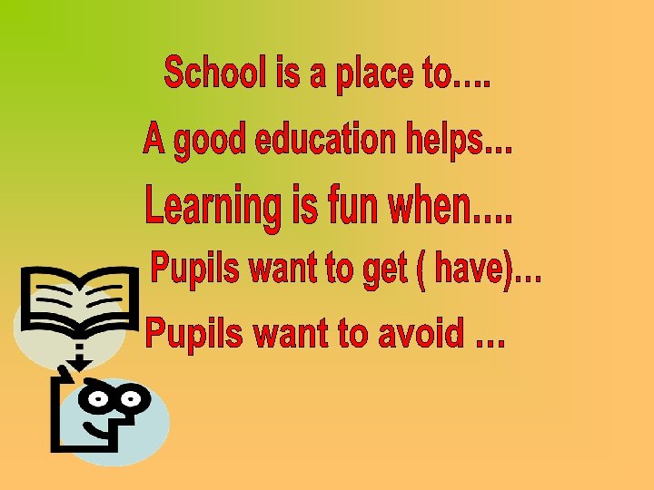 School. . . • introduces me to different sorts of people; • helps me make my own decisions; • helps me understand myself better; • makes me polite and well behaved; • introduces me to new scientific ideas; • helps me to use my free time sensibly; • helps me train for a j ob; • teaches me moral values; • teaches me about your country, its history, culture and its present-day place in the world. • • I think… In my view… I`m sure that… Actually… I`m convinced that… To my mind… In my opinion…