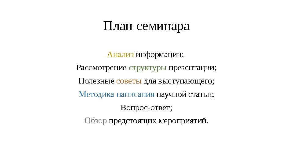 План семинара Анализ информации; Рассмотрение структуры презентации; Полезные советы для выступающего; Методика написания научной статьи; Вопрос-ответ; Обзор предстоящих мероприятий.