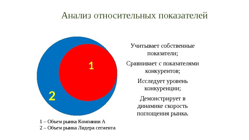 Анализ относительных показателей Учитывает собственные показатели; Сравнивает с показателями конкурентов; Исследует уровень конкуренции; Демонстрирует в динамике скорость поглощения рынка. 131 2 1 – Объем рынка Компании А 2 – Объем рынка Лидера сегмента