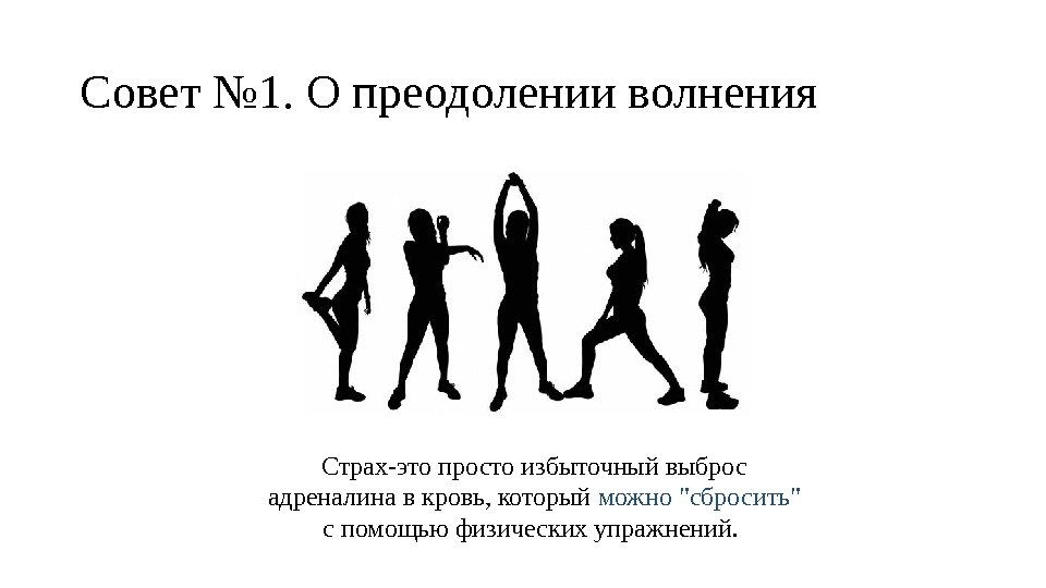 Совет № 1. О преодолении волнения Страх-это просто избыточный выброс адреналина в кровь, который можно «сбросить» с помощью физических упражнений.