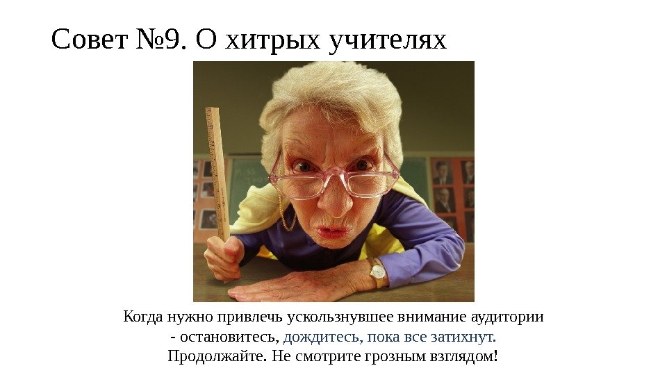Совет № 9. О хитрых учителях Когда нужно привлечь ускользнувшее внимание аудитории — остановитесь, дождитесь, пока все затихнут. Продолжайте. Не смотрите грозным взглядом!