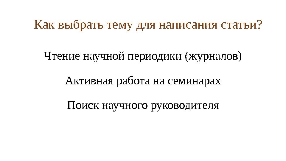 Как выбрать тему для написания статьи? Чтение научной периодики (журналов) Активная работа на семинарах Поиск научного руководителя