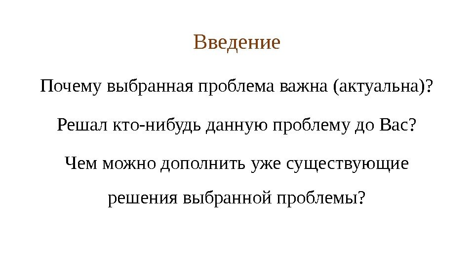 Введение Почему выбранная проблема важна (актуальна)? Решал кто-нибудь данную проблему до Вас? Чем можно дополнить уже существующие решения выбранной проблемы?