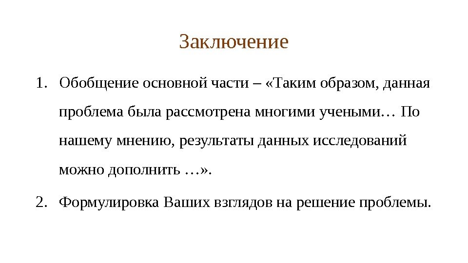 Заключение 1. Обобщение основной части – «Таким образом, данная проблема была рассмотрена многими учеными… По нашему мнению, результаты данных исследований можно дополнить …» . 2. Формулировка Ваших взглядов на решение проблемы.