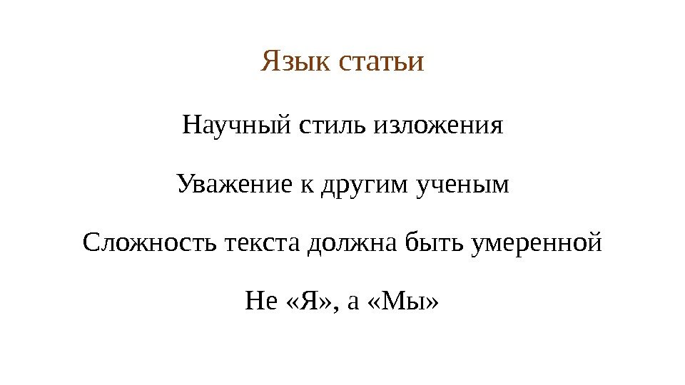 Язык статьи Научный стиль изложения Уважение к другим ученым Сложность текста должна быть умеренной Не «Я» , а «Мы»