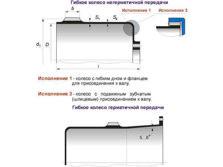 СХЕМА КОНСТРУКЦИИ ВОЛНОВОЙ ПЕРЕДАЧИ 1 – ведущий вал; 2 – кулачок; 3 – эллиптическое кольцо генератора; 4 – корпус волновой передачи с зубчатым венцом 5; 6 – тонкостенная цилиндрическая труба с ведомым валом 7