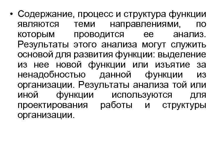 • Содержание, процесс и структура функции являются теми направлениями, по которым проводится ее анализ. Результаты этого анализа могут служить основой для развития функции: выделение из нее новой функции или изъятие за ненадобностью данной функции из организации. Результаты анализа той или иной функции используются для проектирования работы и структуры организации.