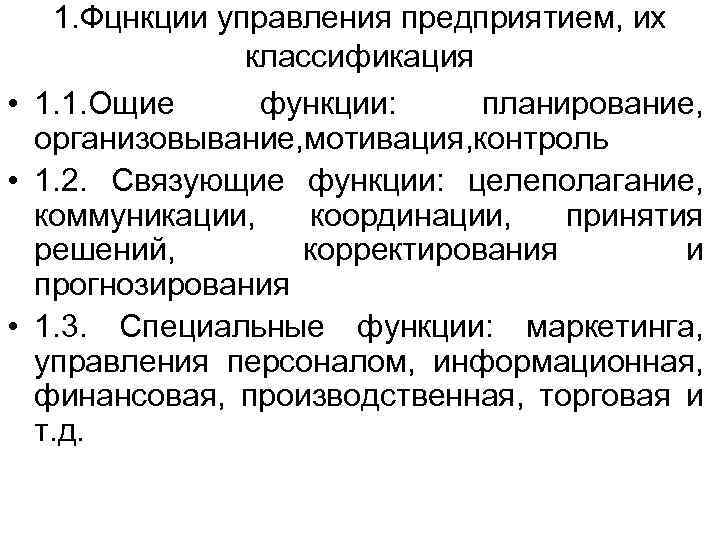 1. Фцнкции управления предприятием, их классификация • 1. 1. Ощие функции: планирование, организовывание, мотивация, контроль • 1. 2. Связующие функции: целеполагание, коммуникации, координации, принятия решений, корректирования и прогнозирования • 1. 3. Специальные функции: маркетинга, управления персоналом, информационная, финансовая, производственная, торговая и т. д.