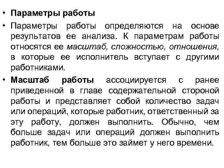 • Параметры работы определяются на основе результатов ее анализа. К параметрам работы относятся ее масштаб, сложностью, отношения, в которые ее исполнитель вступает с другими работниками. • Масштаб работы ассоциируется с ранее приведенной в главе содержательной стороной работы и представляет собой количество задач или операций, которые работник, ответственный за эту работу, должен выполнить. Обычно, чем больше задач или операций должен выполнить работник, тем больше это займет у него времени.