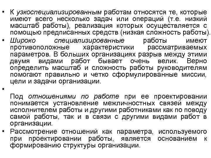 • К узкоспециализированным работам относятся те, которые имеют всего несколько задач или операций (т. е. низкий масштаб работы), реализация которых осуществляется с помощью предписанных средств (низкая сложность работы). • Широко специализированные работы имеют противоположные характеристики рассматриваемых параметров. В больших организациях разрыв между этими двумя видами работ бывает очень велик. Верно определить масштаб и сложность работы руководителям помогают правильно и четко сформулированные миссии, цели и задачи организации. • Под отношениями по работе при ее проектировании понимается установление межличностных связей между исполнителем работы и другими работниками как по поводу самой работы, так и в связи с другими видами работ в организации. • Рассмотрение отношений как параметра, используемого при проектировании работы, является основанием к формированию структуры организации.