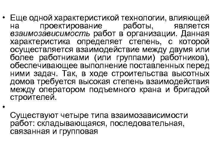 • Еще одной характеристикой технологии, влияющей на проектирование работы, является взаимозависимость работ в организации. Данная характеристика определяет степень, с которой осуществляется взаимодействие между двумя или более работниками (или группами) работников), обеспечивающее выполнение поставленных перед ними задач. Так, в ходе строительства высотных домов требуется высокая степень взаимодействия между оператором подъемного крана и бригадой строителей. • Существуют четыре типа взаимозависимости работ: складывающаяся, последовательная, связанная и групповая