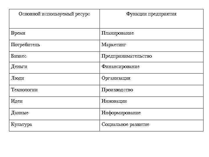 Основной используемый ресурс Функции предприятия Время Планирование Потребитель Маркетинг Бизнес Предпринимательство Деньги Финансирование Люди Организация Технологии Производство Идеи Инновации Данные Информирование Культура Социальное развитие