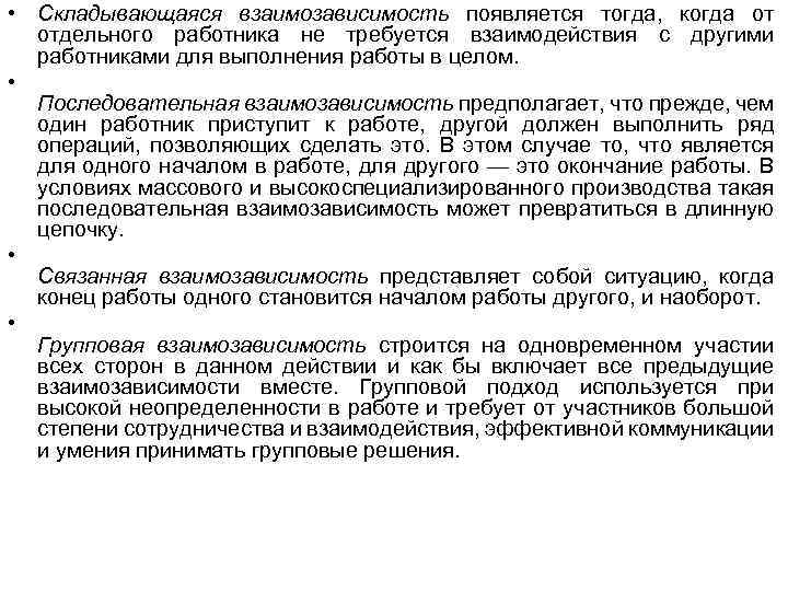 • Складывающаяся взаимозависимость появляется тогда, когда от отдельного работника не требуется взаимодействия с другими работниками для выполнения работы в целом. • Последовательная взаимозависимость предполагает, что прежде, чем один работник приступит к работе, другой должен выполнить ряд операций, позволяющих сделать это. В этом случае то, что является для одного началом в работе, для другого — это окончание работы. В условиях массового и высокоспециализированного производства такая последовательная взаимозависимость может превратиться в длинную цепочку. • Связанная взаимозависимость представляет собой ситуацию, когда конец работы одного становится началом работы другого, и наоборот. • Групповая взаимозависимость строится на одновременном участии всех сторон в данном действии и как бы включает все предыдущие взаимозависимости вместе. Групповой подход используется при высокой неопределенности в работе и требует от участников большой степени сотрудничества и взаимодействия, эффективной коммуникации и умения принимать групповые решения.