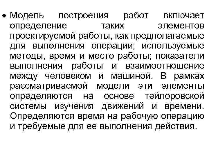 Модель построения работ включает определение таких элементов проектируемой работы, как предполагаемые для выполнения операции; используемые методы, время и место работы; показатели выполнения работы и взаимоотношение между человеком и машиной. В рамках рассматриваемой модели эти элементы определяются на основе тейлоровской системы изучения движений и времени. Определяются время на рабочую операцию и требуемые для ее выполнения действия.